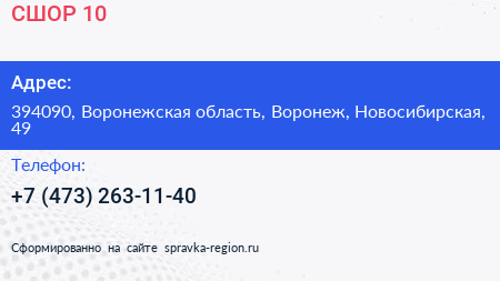 СШОР №10 по адресу 394090, Воронежская область, Воронеж, Новосибирская, 49 в дальнейшем Организация, размещена в следующих категориях: