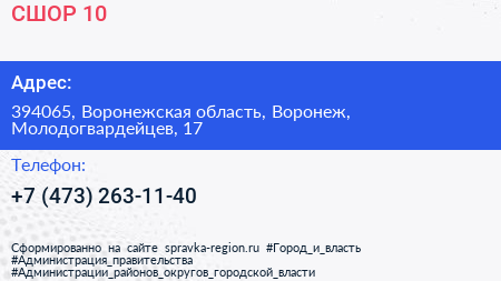 СШОР №10 по адресу 394065, Воронежская область, Воронеж, Молодогвардейцев, 17 в дальнейшем Организация, размещена в следующих категориях: