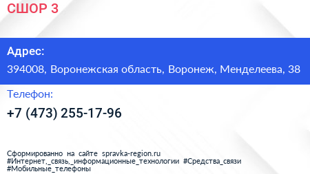 СШОР №3 по адресу 394008, Воронежская область, Воронеж, Менделеева, 38 в дальнейшем Организация, размещена в следующих категориях: