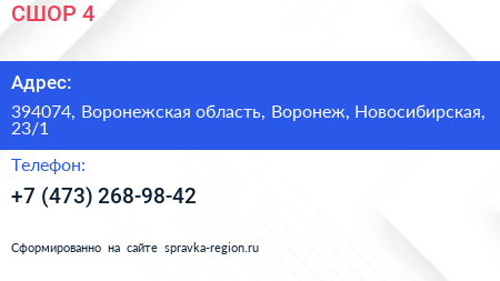 СШОР №4 по адресу 394074, Воронежская область, Воронеж, Новосибирская, 23/1 в дальнейшем Организация, размещена в следующих категориях: