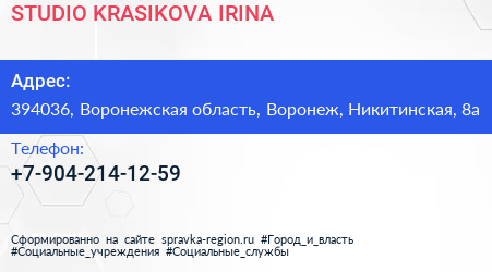 STUDIO KRASIKOVA IRINA по адресу 394036, Воронежская область, Воронеж, Никитинская, 8а в дальнейшем Организация, размещена в следующих категориях: