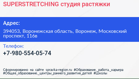 SUPERSTRETCHING, студия растяжки по адресу 394053, Воронежская область, Воронеж, Московский проспект, 116в в дальнейшем Организация, размещена в следующих категориях:
