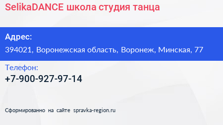 SelikaDANCE, школа-студия танца по адресу 394021, Воронежская область, Воронеж, Минская, 77 в дальнейшем Организация, размещена в следующих категориях: