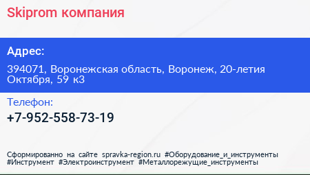Skiprom, компания по адресу 394071, Воронежская область, Воронеж, 20-летия Октября, 59 к3 в дальнейшем Организация, размещена в следующих категориях: