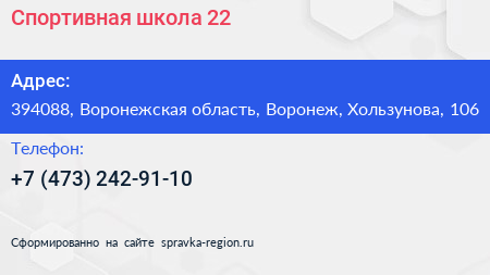 Спортивная школа №22 по адресу 394088, Воронежская область, Воронеж, Хользунова, 106 в дальнейшем Организация, размещена в следующих категориях: