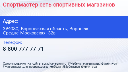 Спортмастер, сеть спортивных магазинов по адресу 394030, Воронежская область, Воронеж, Средне-Московская, 32в в дальнейшем Организация, размещена в следующих категориях: