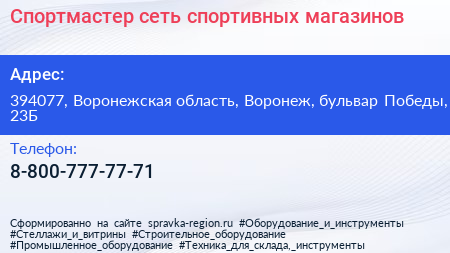Спортмастер, сеть спортивных магазинов по адресу 394077, Воронежская область, Воронеж, бульвар Победы, 23Б в дальнейшем Организация, размещена в следующих категориях: