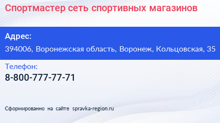 Спортмастер, сеть спортивных магазинов по адресу 394006, Воронежская область, Воронеж, Кольцовская, 35 в дальнейшем Организация, размещена в следующих категориях: