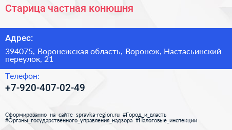 Старица, частная конюшня по адресу 394075, Воронежская область, Воронеж, Настасьинский переулок, 21 в дальнейшем Организация, размещена в следующих категориях: