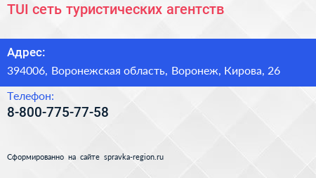 TUI, сеть туристических агентств по адресу 394006, Воронежская область, Воронеж, Кирова, 26 в дальнейшем Организация, размещена в следующих категориях: