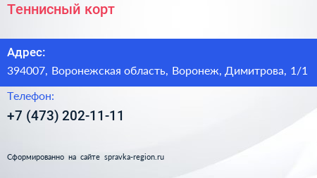 Теннисный корт по адресу 394007, Воронежская область, Воронеж, Димитрова, 1/1 в дальнейшем Организация, размещена в следующих категориях: