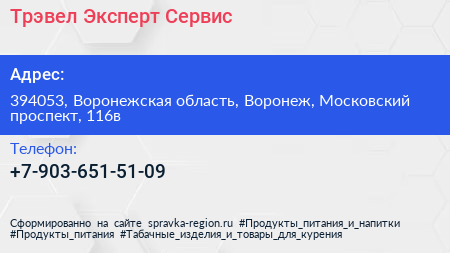 Трэвел Эксперт Сервис по адресу 394053, Воронежская область, Воронеж, Московский проспект, 116в в дальнейшем Организация, размещена в следующих категориях:
