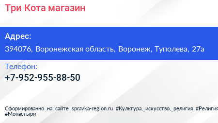 Три Кота, магазин по адресу 394076, Воронежская область, Воронеж, Туполева, 27а в дальнейшем Организация, размещена в следующих категориях: