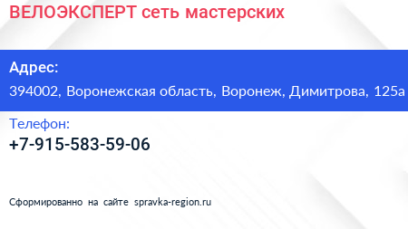 ВЕЛОЭКСПЕРТ, сеть мастерских по адресу 394002, Воронежская область, Воронеж, Димитрова, 125а в дальнейшем Организация, размещена в следующих категориях: