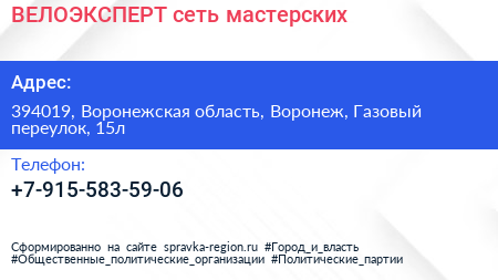ВЕЛОЭКСПЕРТ, сеть мастерских по адресу 394019, Воронежская область, Воронеж, Газовый переулок, 15л в дальнейшем Организация, размещена в следующих категориях: