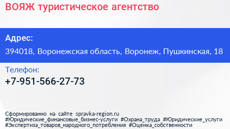 ВОЯЖ, туристическое агентство по адресу 394018, Воронежская область, Воронеж, Пушкинская, 18 в дальнейшем Организация, размещена в следующих категориях: