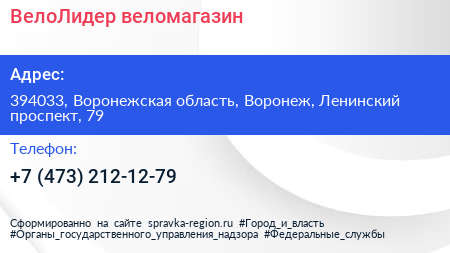 ВелоЛидер, веломагазин по адресу 394033, Воронежская область, Воронеж, Ленинский проспект, 79 в дальнейшем Организация, размещена в следующих категориях: