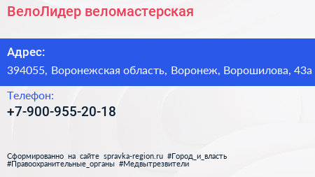 ВелоЛидер, веломастерская по адресу 394055, Воронежская область, Воронеж, Ворошилова, 43а в дальнейшем Организация, размещена в следующих категориях: