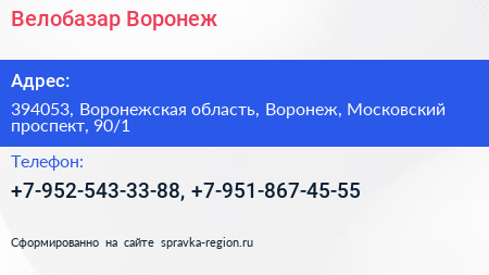 Велобазар Воронеж по адресу 394053, Воронежская область, Воронеж, Московский проспект, 90/1 в дальнейшем Организация, размещена в следующих категориях: