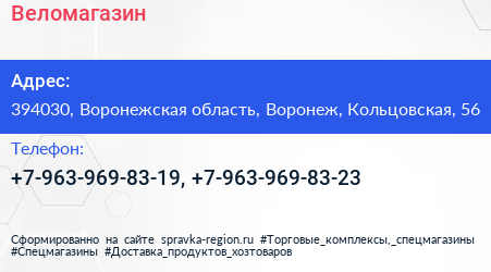 Веломагазин по адресу 394030, Воронежская область, Воронеж, Кольцовская, 56 в дальнейшем Организация, размещена в следующих категориях: