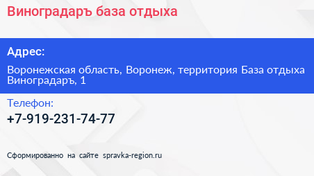 Виноградаръ, база отдыха по адресу Воронежская область, Воронеж, территория База отдыха Виноградаръ, 1 в дальнейшем Организация, размещена в следующих категориях: