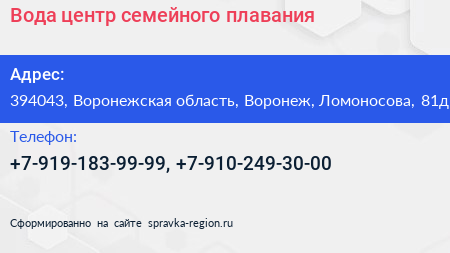 Вода, центр семейного плавания по адресу 394043, Воронежская область, Воронеж, Ломоносова, 81д в дальнейшем Организация, размещена в следующих категориях: