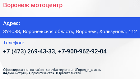 Воронеж, мотоцентр по адресу 394088, Воронежская область, Воронеж, Хользунова, 112 в дальнейшем Организация, размещена в следующих категориях: