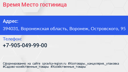 Время & Место, гостиница по адресу 394031, Воронежская область, Воронеж, Островского, 95 в дальнейшем Организация, размещена в следующих категориях: