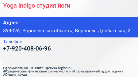 Yoga indigo, студия йоги по адресу 394026, Воронежская область, Воронеж, Донбасская, 2 в дальнейшем Организация, размещена в следующих категориях: