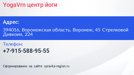 YogaVrn, центр йоги по адресу 394016, Воронежская область, Воронеж, 45 Стрелковой Дивизии, 224 в дальнейшем Организация, размещена в следующих категориях:
