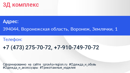 3Д комплекс по адресу 394044, Воронежская область, Воронеж, Землячки, 1 в дальнейшем Организация, размещена в следующих категориях: