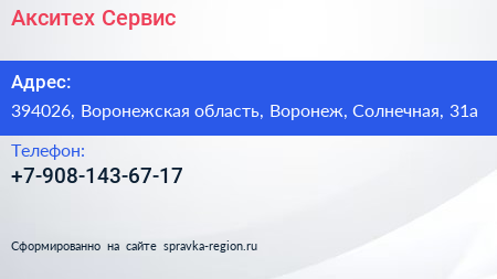 Акситех Сервис по адресу 394026, Воронежская область, Воронеж, Солнечная, 31а в дальнейшем Организация, размещена в следующих категориях: