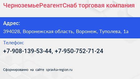 ЧерноземьеРеагентСнаб, торговая компания по адресу 394028, Воронежская область, Воронеж, Туполева, 1а в дальнейшем Организация, размещена в следующих категориях: