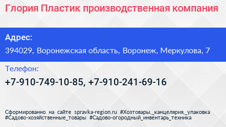 Глория Пластик, производственная компания по адресу 394029, Воронежская область, Воронеж, Меркулова, 7 в дальнейшем Организация, размещена в следующих категориях: