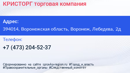 КРИСТОРГ, торговая компания по адресу 394014, Воронежская область, Воронеж, Лебедева, 2д в дальнейшем Организация, размещена в следующих категориях: