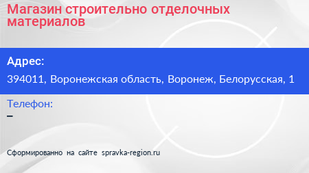 Магазин строительно-отделочных материалов по адресу 394011, Воронежская область, Воронеж, Белорусская, 1 в дальнейшем Организация, размещена в следующих категориях: