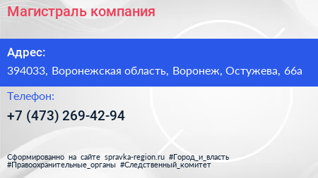 Магистраль, компания по адресу 394033, Воронежская область, Воронеж, Остужева, 66а в дальнейшем Организация, размещена в следующих категориях: