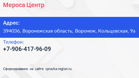 Мероса Центр по адресу 394036, Воронежская область, Воронеж, Кольцовская, 9а в дальнейшем Организация, размещена в следующих категориях: