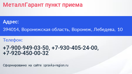 МеталлГарант, пункт приема по адресу 394014, Воронежская область, Воронеж, Лебедева, 10 в дальнейшем Организация, размещена в следующих категориях: