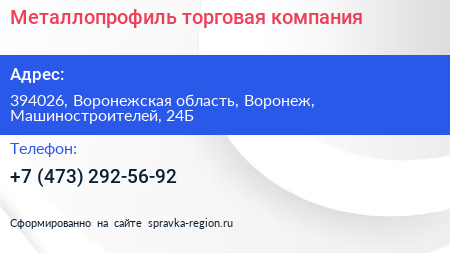 Металлопрофиль, торговая компания по адресу 394026, Воронежская область, Воронеж, Машиностроителей, 24Б в дальнейшем Организация, размещена в следующих категориях: