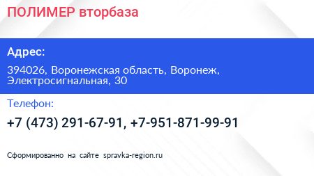 ПОЛИМЕР, вторбаза по адресу 394026, Воронежская область, Воронеж, Электросигнальная, 30 в дальнейшем Организация, размещена в следующих категориях:
