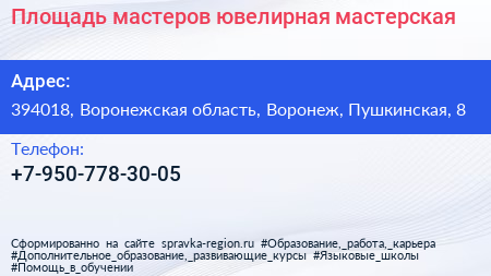 Площадь мастеров, ювелирная мастерская по адресу 394018, Воронежская область, Воронеж, Пушкинская, 8 в дальнейшем Организация, размещена в следующих категориях: