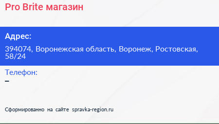 Pro-Brite, магазин по адресу 394074, Воронежская область, Воронеж, Ростовская, 58/24 в дальнейшем Организация, размещена в следующих категориях: