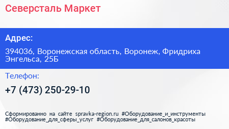 Северсталь Маркет по адресу 394036, Воронежская область, Воронеж, Фридриха Энгельса, 25Б в дальнейшем Организация, размещена в следующих категориях: