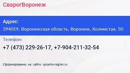 СварогВоронеж по адресу 394019, Воронежская область, Воронеж, Холмистая, 50 в дальнейшем Организация, размещена в следующих категориях: