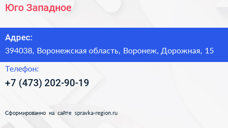 Юго-Западное по адресу 394038, Воронежская область, Воронеж, Дорожная, 15 в дальнейшем Организация, размещена в следующих категориях: