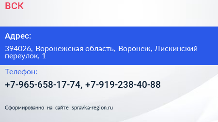 ВСК по адресу 394026, Воронежская область, Воронеж, Лискинский переулок, 1 в дальнейшем Организация, размещена в следующих категориях: