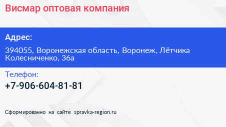Висмар, оптовая компания по адресу 394055, Воронежская область, Воронеж, Лётчика Колесниченко, 36а в дальнейшем Организация, размещена в следующих категориях: