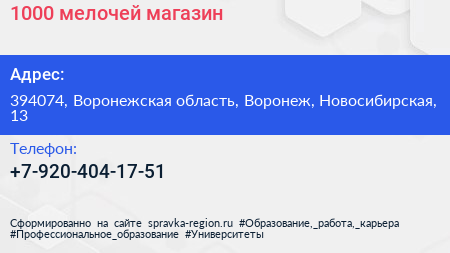 1000 мелочей, магазин по адресу 394074, Воронежская область, Воронеж, Новосибирская, 13 в дальнейшем Организация, размещена в следующих категориях: