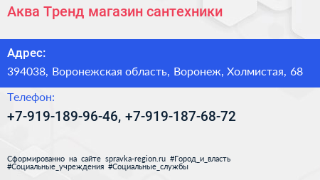Аква Тренд, магазин сантехники по адресу 394038, Воронежская область, Воронеж, Холмистая, 68 в дальнейшем Организация, размещена в следующих категориях:
